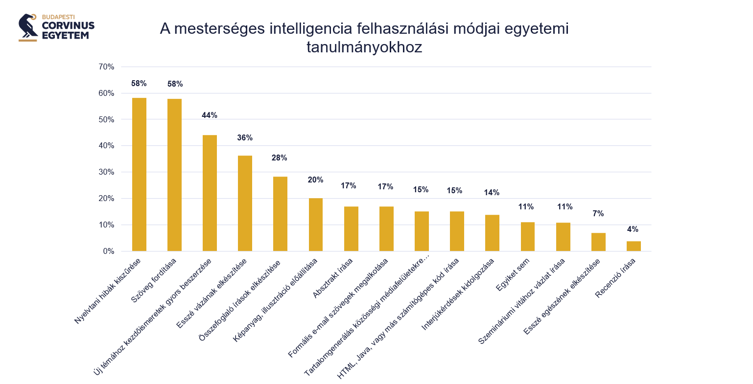 A válaszadók a legnagyobb arányban a nyelvtani hibák kiszűréséhez és fordításhoz (58-58 százalék), új témák esetén kezdőismeretek gyors összegyűjtéséhez (44 százalék), esszévázlatok vagy összefoglaló írások elkészítéséhez (36, illetve 28 százalék) vesznek igénybe MI-t. A felmérés résztvevőinek 85 százaléka ugyanakkor nem kapott tájékoztatást sem a szolgáltatótól sem máshonnan az MI alkalmazásának etikai vonatkozásairól vagy nem emlékszik ilyenre.