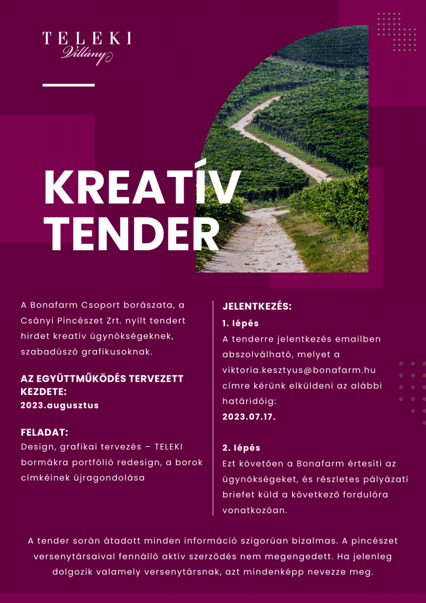 A Bonafarm Csoport borászata, a Csányi Pincészet Zrt. nyílt tendert hirdet kreatív ügynökségeknek, szabadúszó grafikusoknak.