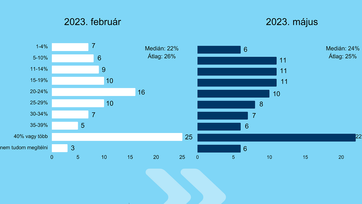 A kutatás eredményei szerint a huszonéves fiatalok 40 százaléka érzékelt 20 százalék alatti áremelkedést, az általuk vásárolt termékeknél, egyebek mellett élelmiszereknél, ruháknál és különböző szolgáltatásoknál. Ez javulást jelent februárhoz képest: akkor csak 34 százalékuk beszélt 20 százalék alatti drágulásról. A hivatalos inflációs adathoz hasonló - 20-24 százalékos - inflációt tapasztalt a fiatalok 10 százaléka, szemben a februári kutatással, amikor ez 15 százalékukra volt igaz. Ezen túl májusban a válaszadók 22 százaléka, míg három hónappal korábban még 25 százalékuk mondott 40 százalék feletti árszínvonal-emelkedést.