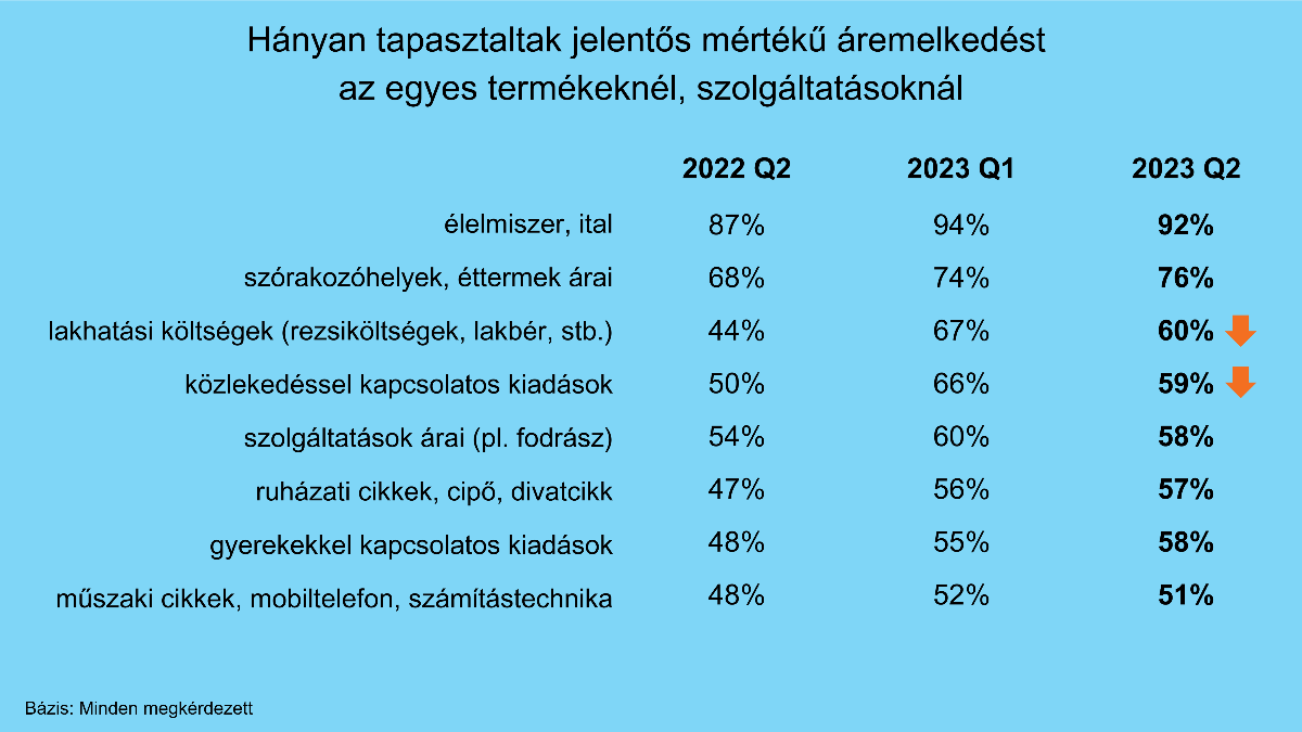 Miközben az élelmiszereknél és az éttermeknél a válaszadók döntő hányada érzékelt jelentős drágulást éves összevetésben, a lakhatási kiadások esetében némiképp kedvezőbb lett a helyzet. A második negyedévben a lakásfenntartási kiadásokat a megkérdezettek 60 százaléka mondta jóval magasabbnak az egy évvel korábbinál. Bár ez még mindig jóval magasabb, mint az egy évvel ezelőtt mért 44 százalékos arány, az előző negyedév 67 százalékos értékéhez viszonyítva úgy tűnik, elindulhatott egy kedvező irányú változás. A közlekedéssel kapcsolatos kiadások esetén is hasonló trendfordulóhoz érkezhettünk: most 59 százalék érzékelt komolyabb áremelkedést, ami még mindig meghaladja az egy évvel ezelőtti 50 százalékos arányt, de az előző negyedév 66 százalékos értékéhez képest már itt is csökkenés kezdődött.