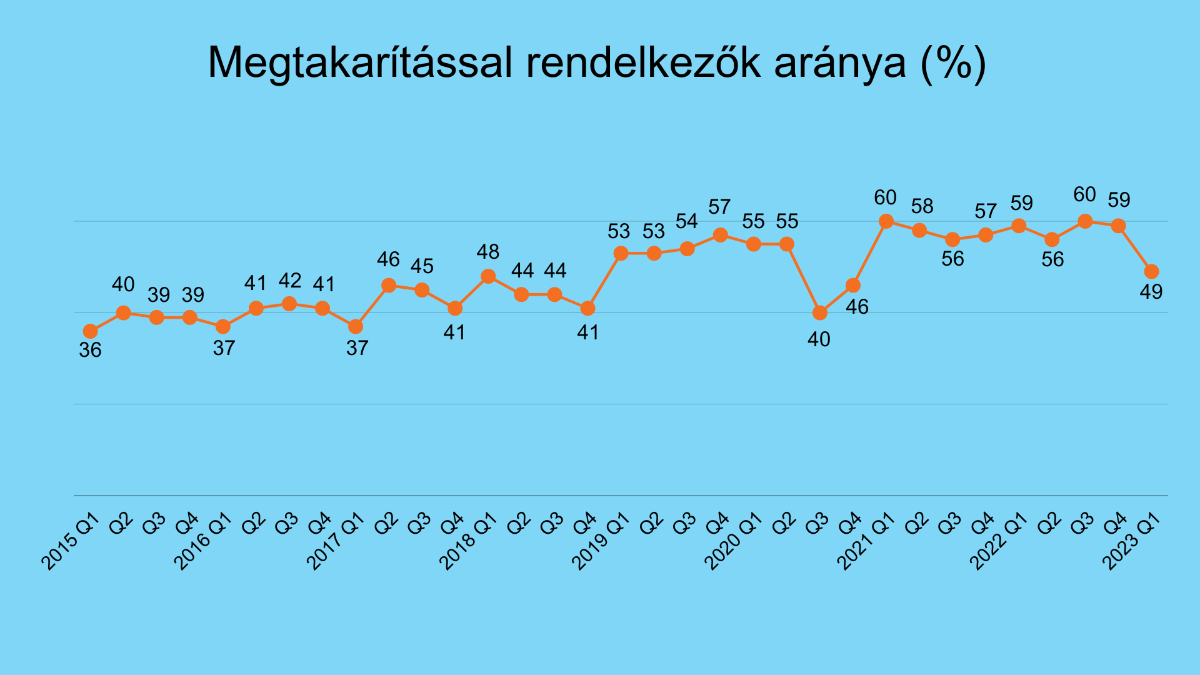 Az idei első negyedévben a többségében huszonéves fiatalok 49 százalékának volt valamekkora megtakarítása. Ez jelentős csökkenést jelent a felmérés korábbi eredményeihez képest: 2021 első negyedéve óta 56-60 százalék közötti volt az arányuk.