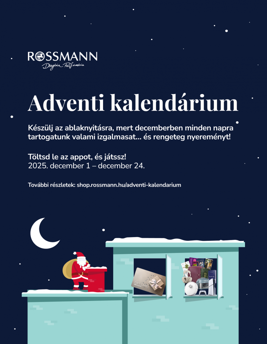 Az adventi kalendárium mellett X-MAS kuponnal is vár a Rossmann az adventi időszakban: 15% végösszegi kedvezmény üzletekben, 10% végösszegi kedvezmény az Online Drogériában Rossmann+ tagoknak 2025.12.01-22. között! A kupon szintén a Rossmann applikáció Kuponközpontjában aktiválható vásárlás előtt.