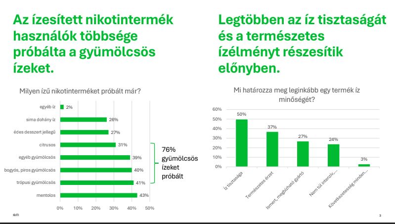 A lakosság közel harmada hagyományos cigarettát fogyaszt, és a cigarettázók többsége rendszeres használónak számít, ami tovább erősíti a klasszikus dohánytermékek dominanciáját. Ugyanakkor a cigarettát használók több mint fele nyitott az alternatív - hazánkban legálisan elérhető - hevítéses, dohánymentes, nikotint tartalmazó megoldások kipróbálására is. Ezen kategóriában, különösen – az engedélyezett - ízesített változatok iránt mutatkozik nagyobb érdeklődés, ami a fogyasztói preferenciák lassú átalakulására utal.